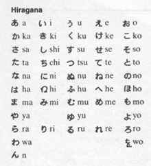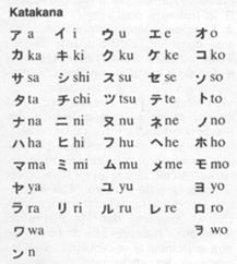 Pour commencer il fallait donc créer des caractères spéciaux pour tous ces mots qui servent de liaison et de définition ainsi que pour les terminaisons des mots, c. à d. les flexions qui font les déclinaisons. Pour obtenir ce résultat on va d’ailleurs dans la plupart des cas utiliser des caractères chinois existants, mais les utiliser en fonction de leurs sons. Une fois cette barrière franchie plus rien ne s’oppose à ce que l’on adopte également d’autres caractères chinois - ce que les Coréens avaient déjà fait pour leur propre langue - pour transcrire des mots japonais sur un mode phonique. D’où la création dès l’origine d’un alphabet syllabique. Un tel alphabet syllabique existe encore aujourd’hui sous deux formes: les hiragana (écriture cursive) et les katakana (caractères plus carrés, surtout utilisés pour la transcription de nom étrangers). Cet alphabet est essentiellement composé de 50 caractères dont 5 voyelles, les autres étant des suites consonne-voyelle (le japonais ne connaît ni doublement de consonnes, ni consonne finale, sauf une nasale n ou ng, ce qui facilite évidemment l’adoption d’un syllabaire aussi simple, mais ce qui a quand même un inconvénient majeur: c’est que mon nom de famille doit s’écrire en japonais turutu!).