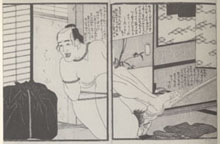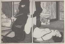 Et puis je dois dire - en m’excusant auprès de mes lecteurs qui en seraient - que Saikaku, visiblement, n’appréciait pas trop les pédérastes. Qui semblaient être nombreux à l’époque tant parmi les moines que parmi les Samouraïs. Il est vrai que quand un groupe d’hommes essaye de se passer de la femme... Et les sociétés trop martiales (voir Sparte ou les SA de Roehm) ont toujours fini par pratiquer l’homosexualité. Saikaku s’en moque. Comme dans la dernière histoire, la seule à finir bien, l’histoire de O-Man et de Gengobei. Voici comment Saikaku raconte la scène où la belle O-Man, amoureuse du moine Gengobei qui jusque-là ne trouvait son plaisir qu’avec de beaux éphèbes, le dupe en se faisant passer jusqu’au dernier instant pour un garçon: