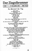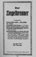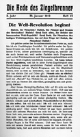 Et puis commence sa vie de révolutionnaire. Le premier numéro de sa revue radicale Der Ziegelbrenner, paraît en septembre 1917. Comme la Fackel de Karl Kraus il en est le seul éditeur et le seul rédacteur. Comme Kraus encore il attaque les médias responsables de l’abêtissement du public. Comme Kraus il est profondément pacifiste. Mais contrairement à Kraus, dont les conférences sont une véritable attraction pour les intellectuels viennois (voir la description amusée qu’en fait Elias Canetti dans Die Fackel im Ohr) Marut évite de paraître en public (il fera deux conférences à Munich en décembre 1918; la première sera passablement chahutée; les deux fois l’orateur et la salle sont plongés dans l’obscurité). Par ailleurs ses prises de position sont beaucoup plus radicales que celles de Kraus, son style rude et agressif n’a rien à voir avec celui très policé et littéraire de Kraus, la notoriété du Ziegelbrenner n’a évidemment jamais approché celle de la Fackel et sa diffusion est restée tout ce qu’il y a de plus confidentielle.